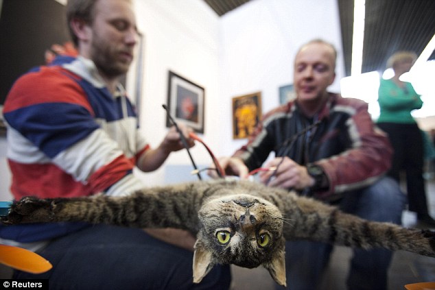 Dutch artist Bart Jansen first stuffed Orville before teaming up with radio control helicopter flyer Arjen Beltman to build a specially-designed flying mechanism to attach to the cat.